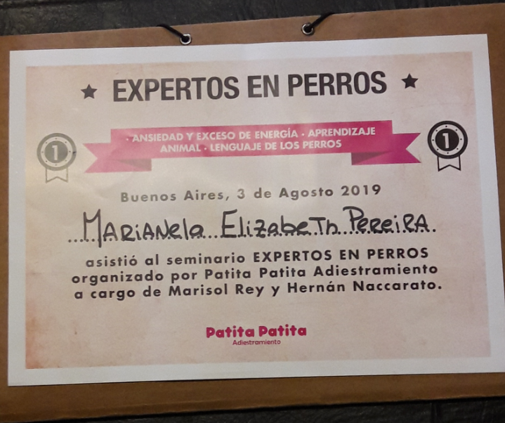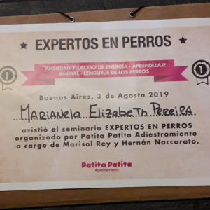 Siempre utilizó métodos amigables y respetuosos con el perro. Seminario sobre ansiedad ,exceso de energia y lenguaje en los perros, en escuela patita patita adiestramiento.