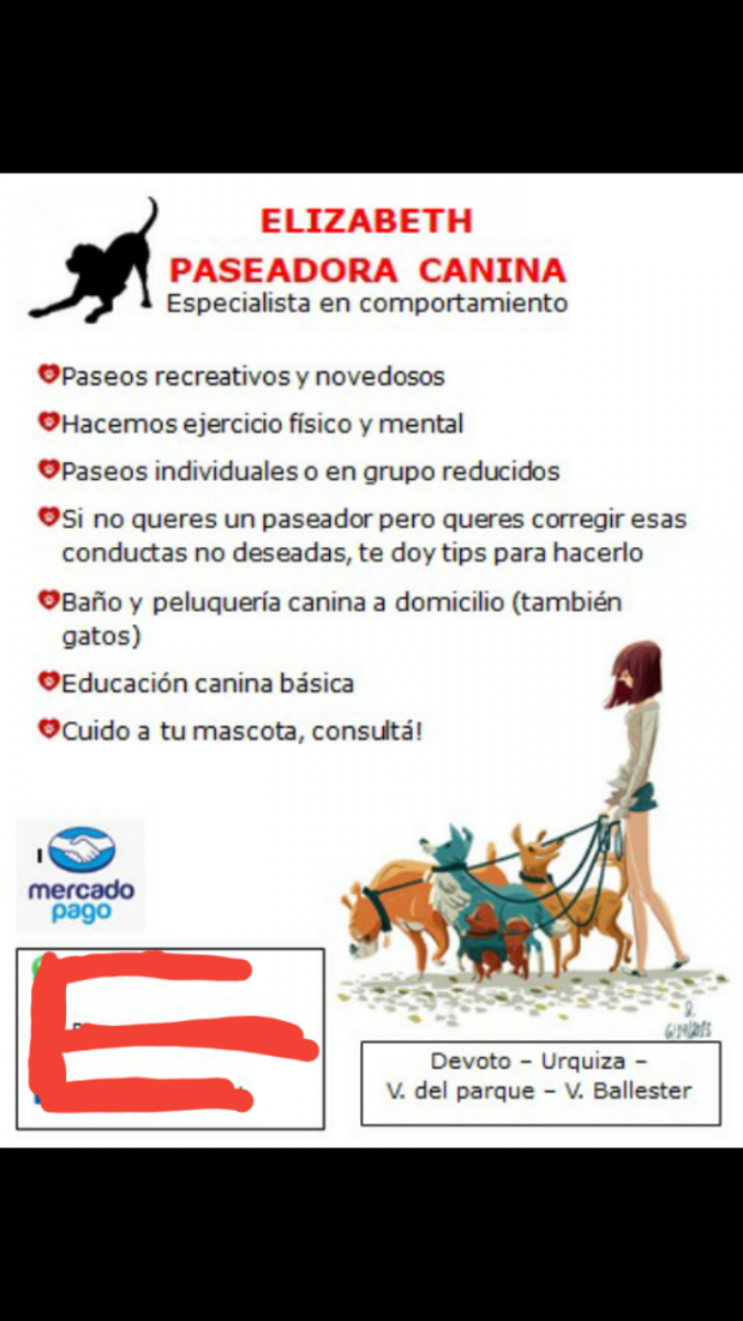 Elizabeth tiene mucho conocimiento sobre el comportamiento canino. Le enseño a mí perro a no tirar de la correa y no cruzar el cordon.Se dedica esto porque es su vocación. Y toma cursos constantemente. Mí perro tiene un paseo dónde hace ejercicio físico pero también mental. Y se pone contento cuando la ve. Muy recomendable.