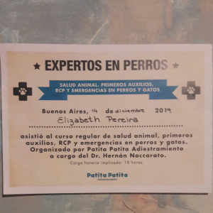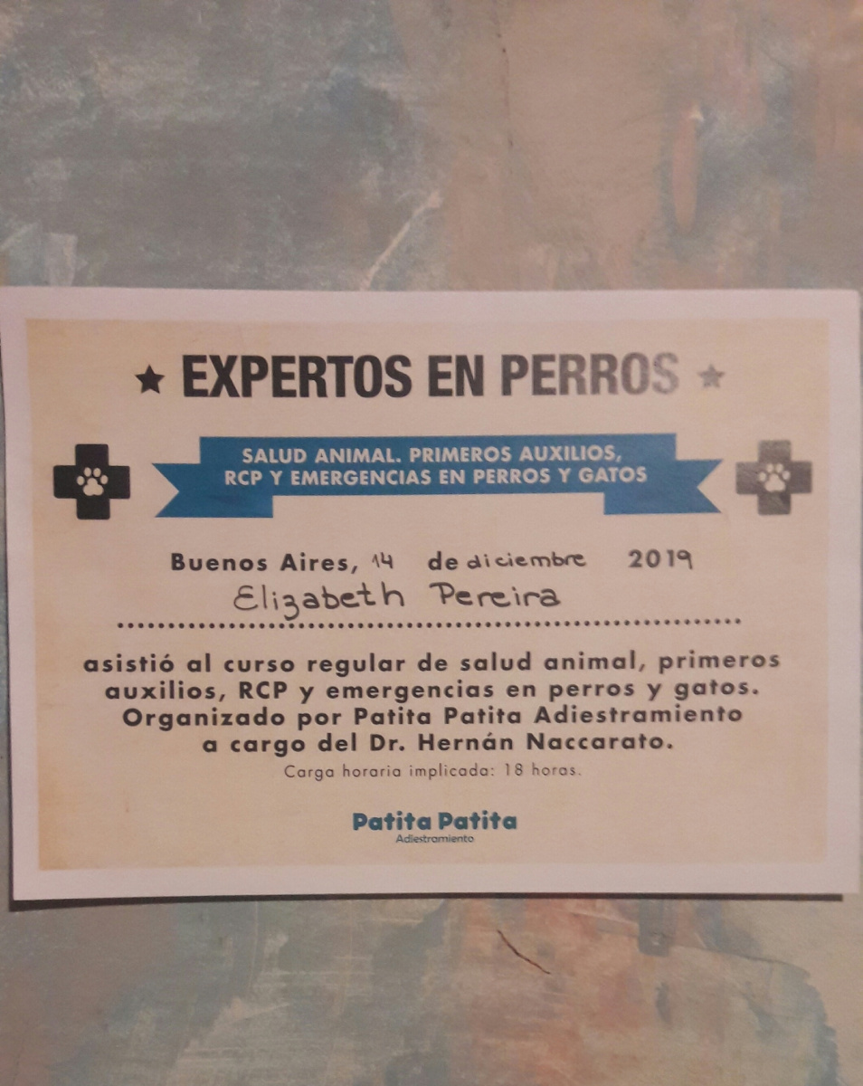 En casa los miembros de la familia somos: mi hija, yo,1 perrita y 3 gatos. Trabaje haciendo paseos voluntarios en zoonosis de San Martín (declarado de interés municipal), donde trabajamos conjuntamente con un etologo. Quien nos capacitaba continuamente sobre el comportamiento de los perros. Curso de comportamiento en animales.